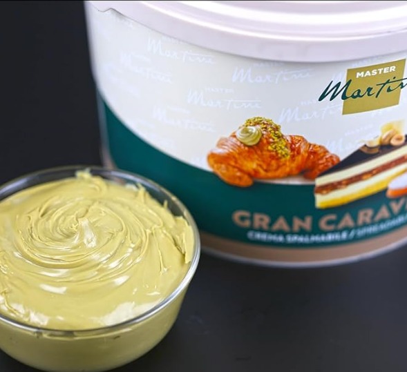 Lujosa crema de pistacho: la crema de pistacho Master Martini Gran Caravella ofrece una indulgente y suave para untar, perfecta para elevar cualquier postre o bien horneado con un rico sabor a nuez. Contiene un 15% de pistachos.